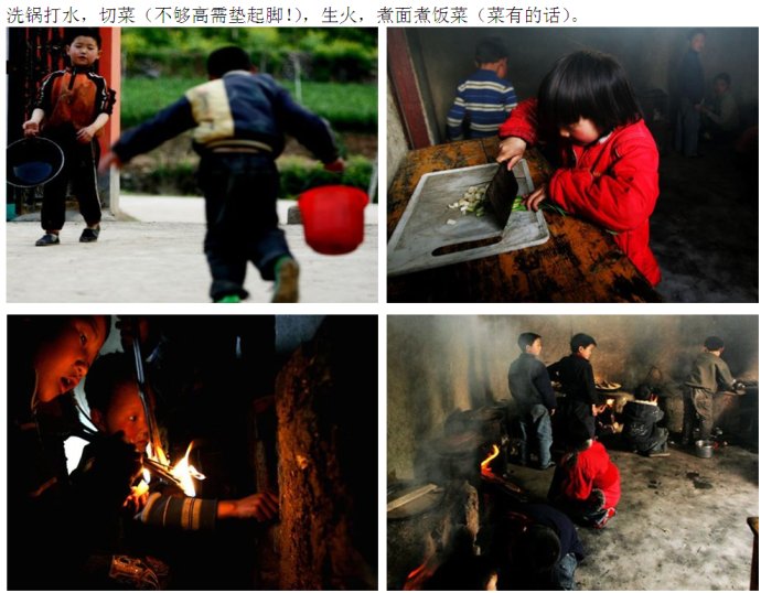 Wang ditch Luoyang Town SONGXIAN Germany an obscure village, Wang ditch school has 38 students and two teachers. School a small kitchen, there are eight Tuzao teacher. School a small kitchen, there are eight Tuzao, every child is his "cooks." 6-year-old live-in students Tiangeng Park, Li Hailong, after school himself collecting firewood, carrying water for cooking; Guojiguo 11 years, only one chopstick to eat, he said: "I have two weeks did not eat vegetables and oil a. "(Editor's note: eat pasta?)
